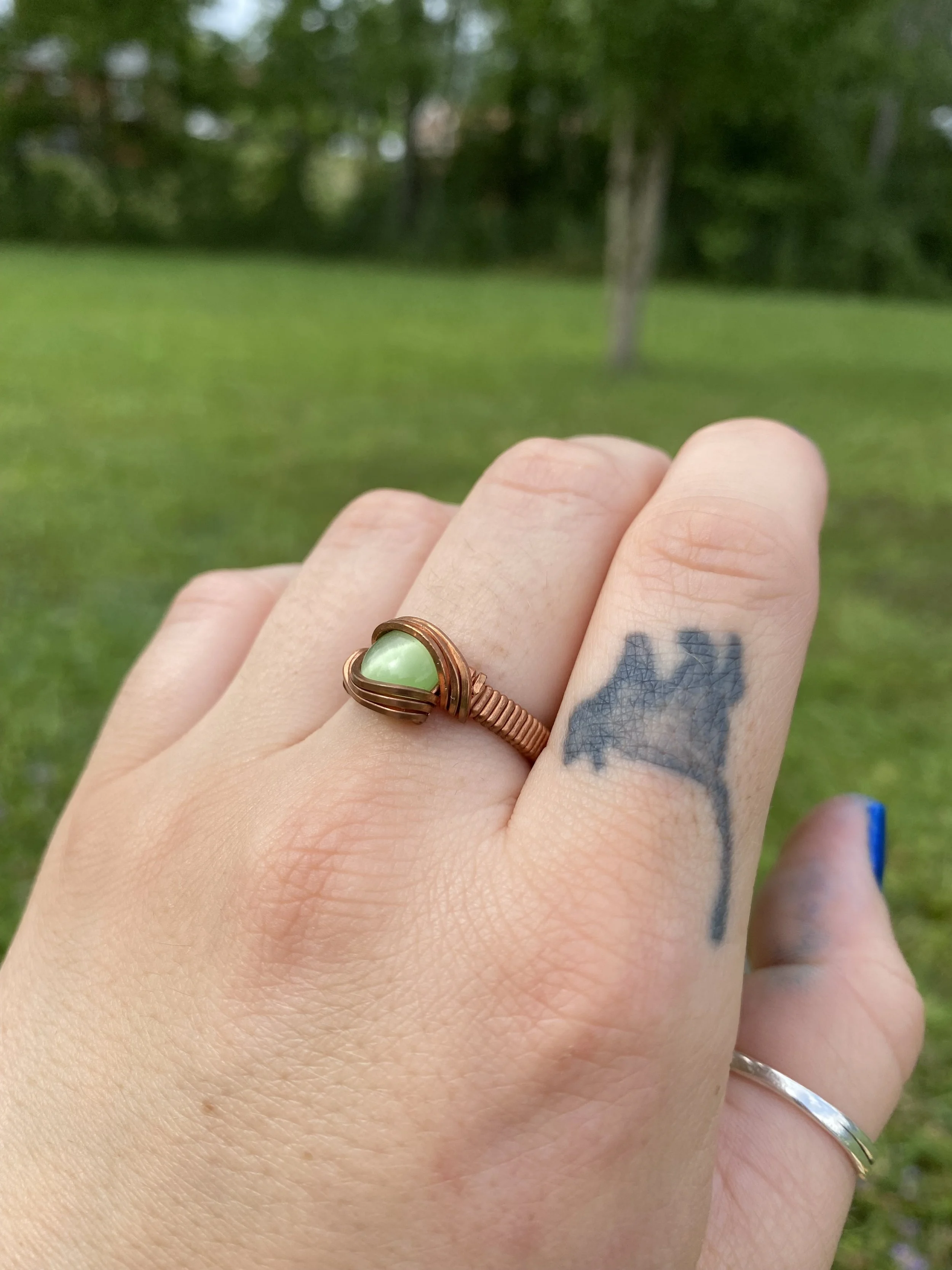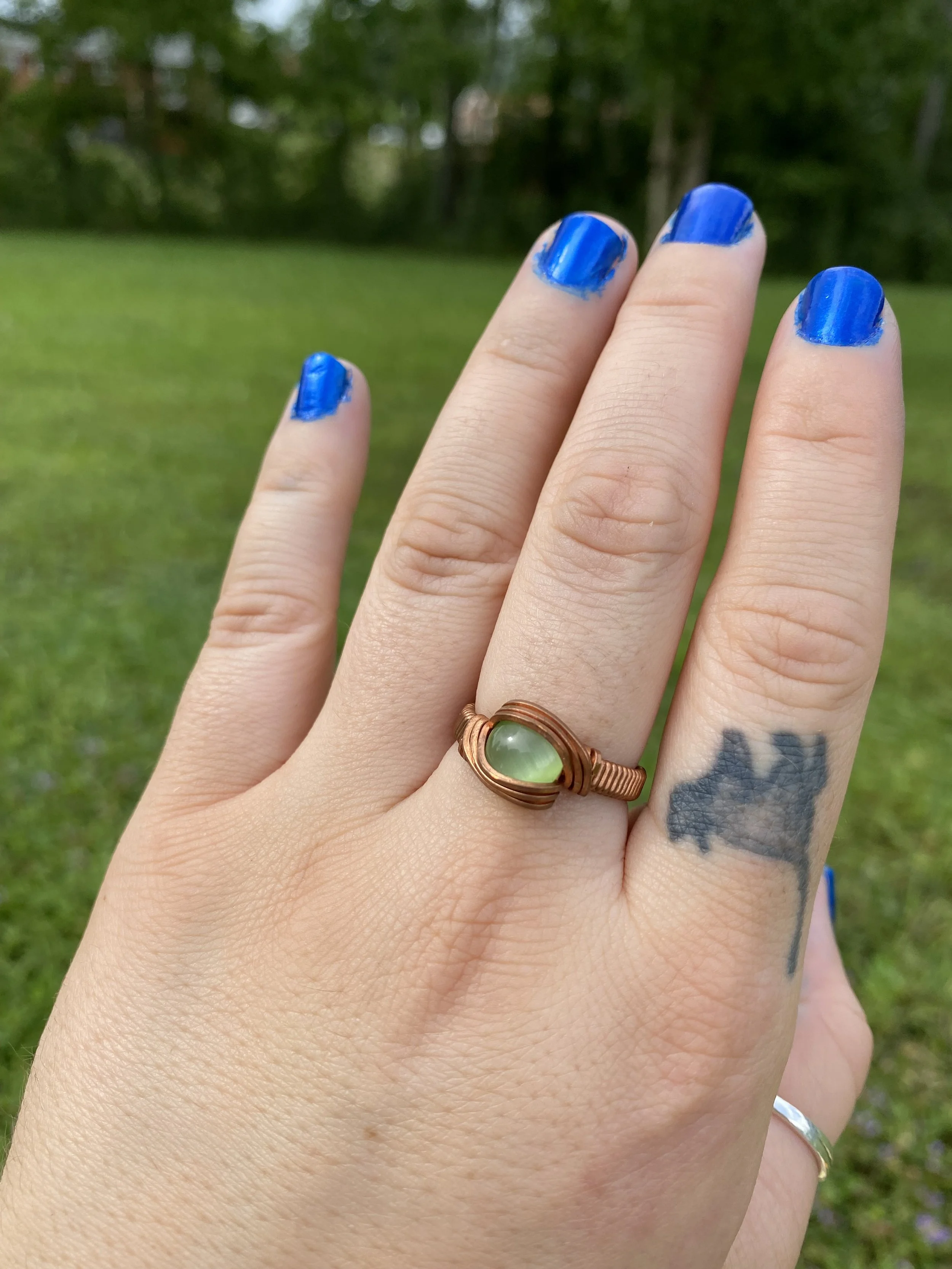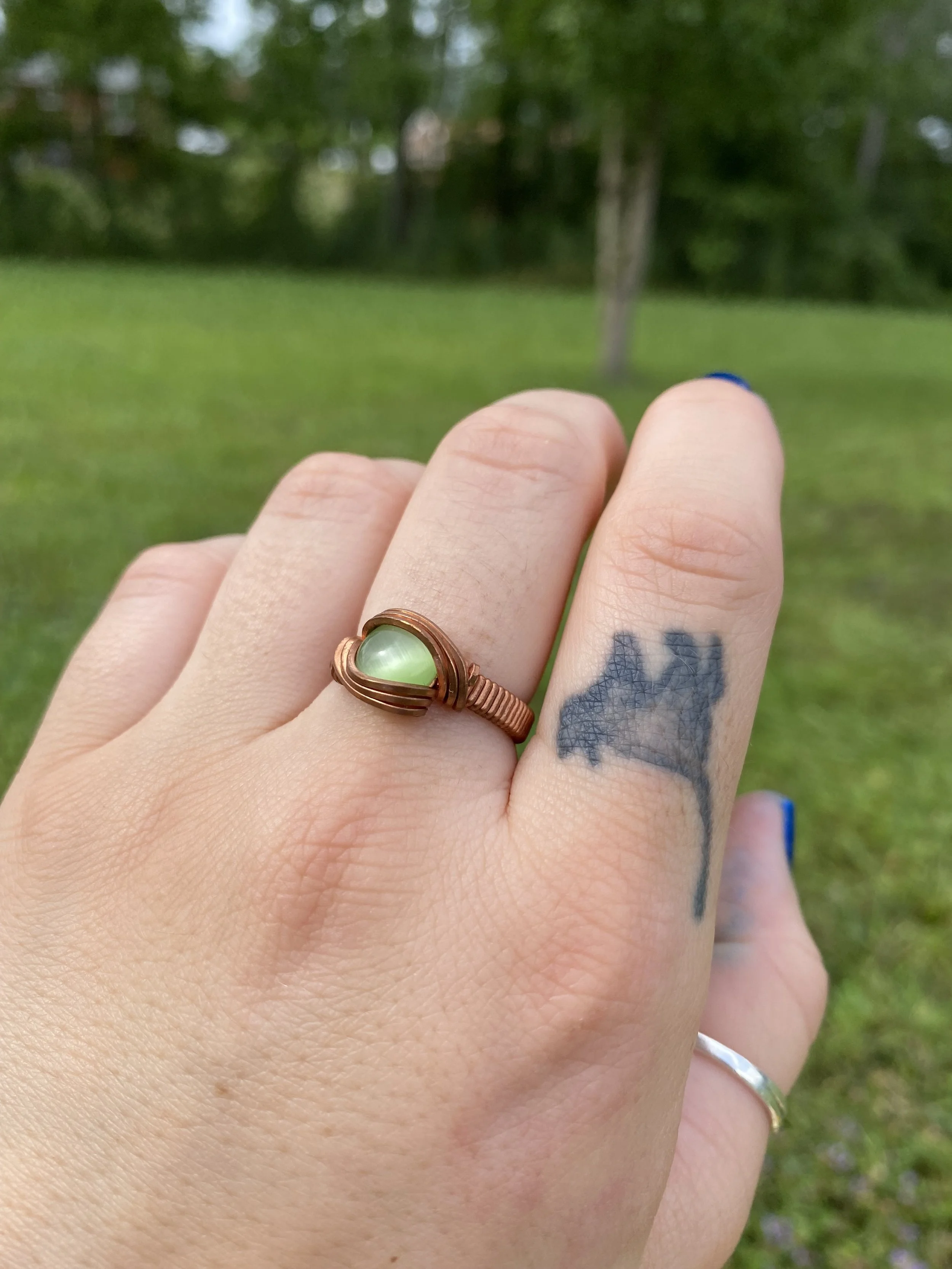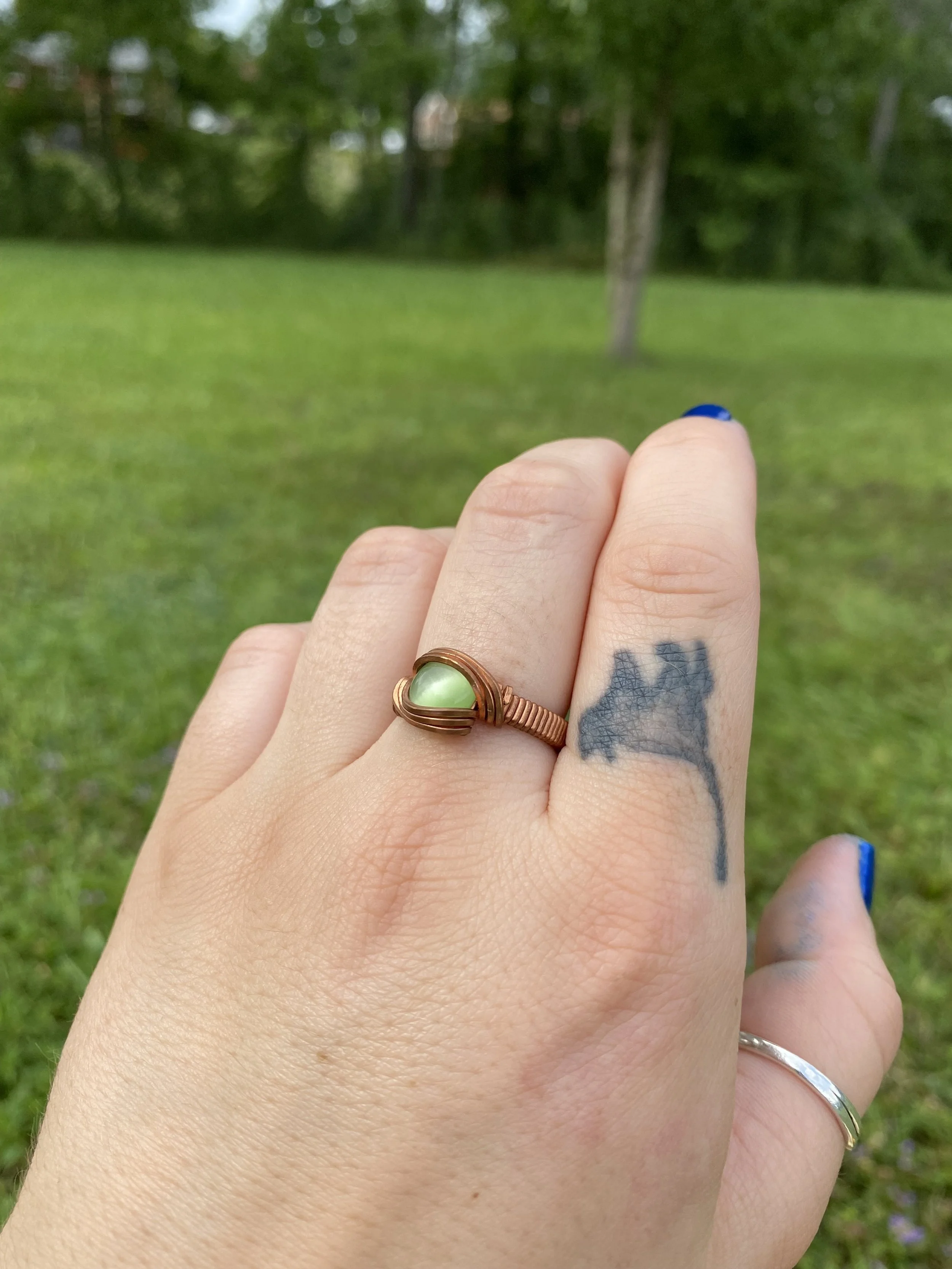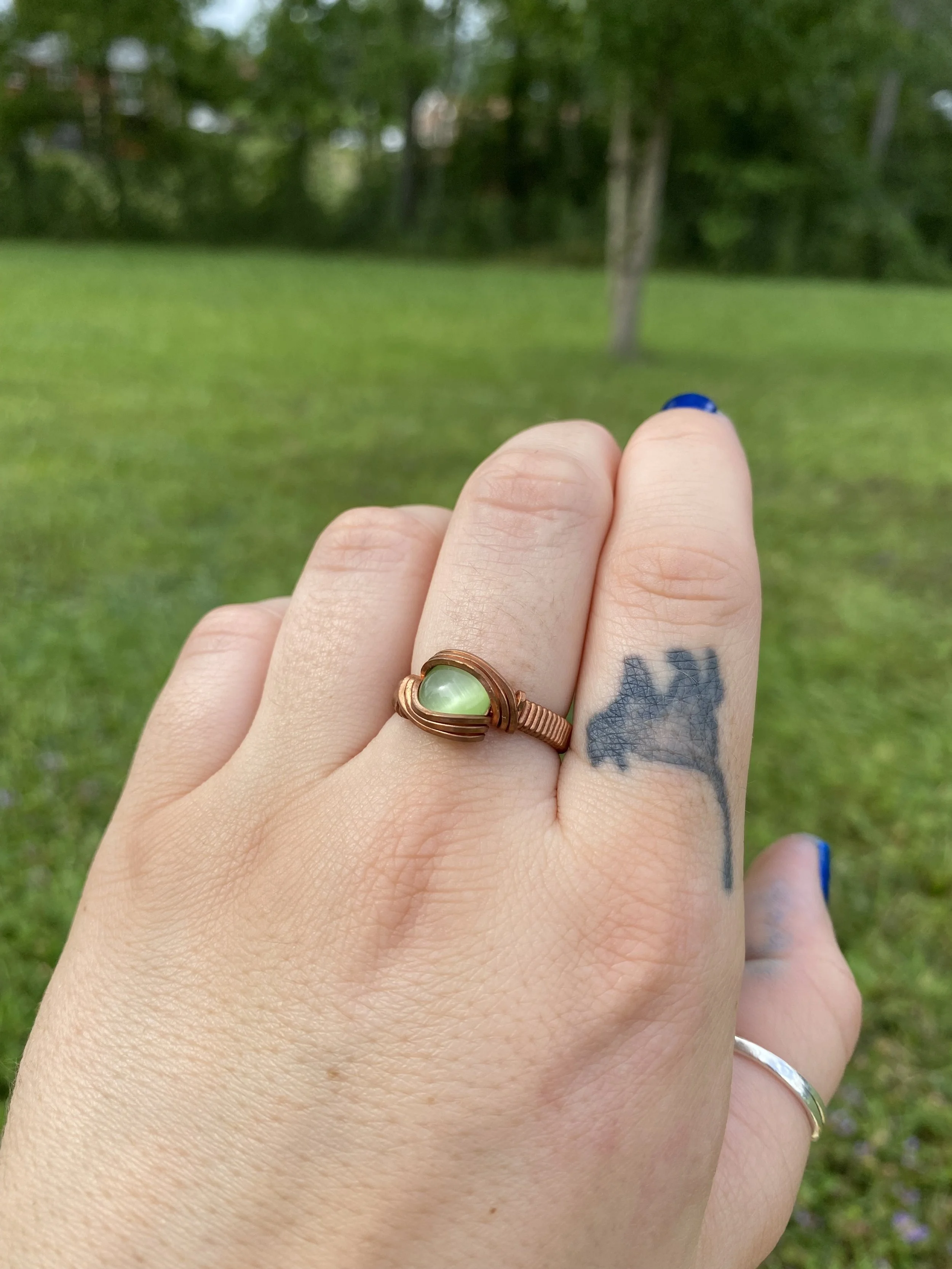 Green Cats Eye Ring Wrapped in Copper - Size 7 & 1/2
